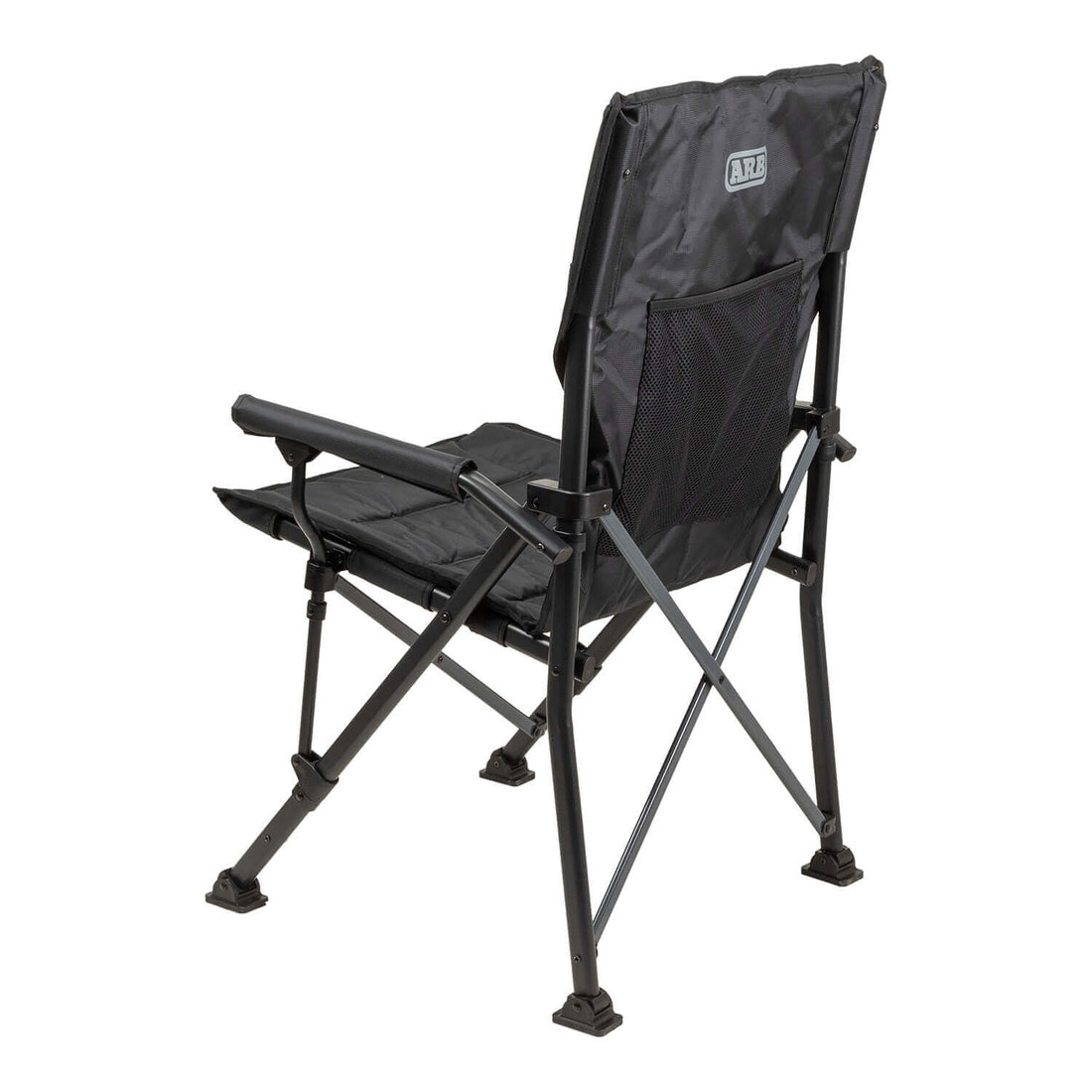 The ARB Base Camp Chair is the perfect all-round chair for traveling. It features a sturdy, sleek black steel frame with contrasting charcoal crossbars. The chair's body is made from 600D polyester and 420D ripstop panels and features a tonal print and internal padding. Padded armrests provide homelike comfort. The chair also features a rear mesh storage pocket and a swivel cup holder to keep your drink close. A spacious 600D polyester carry bag accompanies the chair, featuring webbing straps and a premium shoulder pad for easy storage and carrying.