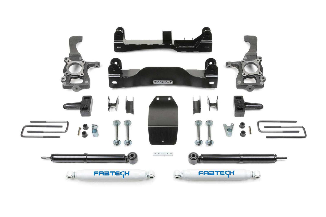 Fabtech's 4" F150 system utilizes their proven heavy duty construction and design features found in their 6" systems but with less lift and at a much lower price. This 4" System allows use of 35" tall tires and features high arched lower control arm crossmembers constructed of 1/4 €œ thick steel for maximum strength. The Fabtech ductile iron steering knuckles retain the stock track width keeping tires under the fender for a clean appearance. Rear lift is accomplished with a block and u-bolt configuration.