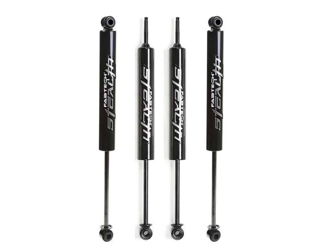 Fabtech's Stealth monotube shocks are built with a 46mm diameter high flow piston and vehicle specific valving, for a great ride with oversized tires. Each Stealth shock absorber has a free floating piston that separates the nitrogen gas charge from the oil to reduce shock fade in off-road conditions. Stealth is the first all black monotube shock absorber, with an identifiable raised metal nameplate, that represents the signature of quality you can rely on for a superior ride at an affordable price. All Stealth shock absorbers feature Nitrocarburized piston rods that are superior to chromed rods in durability and corrosion resistance. These "Nitrocarb" piston rods are finished in matte black for a complete "black out" shock package.