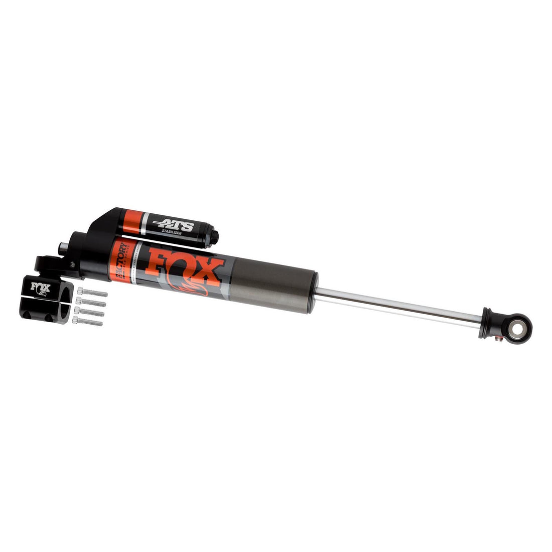 The FOX Factory Race Series Adjustable Through Shaft (ATS) steering stabilizer offers unrivaled steering control and a striking high tech appearance. The technologically advanced design cancels unwanted steering forces in both directions, taking the place of two conventional opposing stabilizers. It will also respond to your input with 24 clicks of external adjustment to fine tune the feel. The integrated reservoir allows for additional fluid capacity and improves cooling during extreme use. Also included is FOX's relocating hardware that moves the steering stabilizer up and out of the way utilizing a new track bar relocation bolt and 1-3/8" tie-rod mounting clamp. An optional 1-5/8" mounting clamp is available for larger aftermarket tie-rods. The ATS represents a revolutionary breakthrough in stabilizer design.