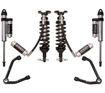ICON Vehicle Dynamics 2014-2018 GM Silverado/Sierra 1500 suspension systems are designed to dramatically increase the on and off-road ride quality. ICON engineers'imary focus is to increase wheel travel and damping ability, which translates into outstanding vehicle control and ride quality both on and off-road. With wheel travel and ride quality in mind, ICON engineers researched each component of the GM platform'uspension and addressed any areas where performance could be extracted. The Stage 4 system provides a higher level of performance that will drastically improve overall on and off-road vehicle ride characteristics. ICON'ehicle-specific tuned 2.5" remote reservoir coilover shocks and ICON 2.5 Series piggyback rear shocks in this system provide exceptional cooling properties, with the coilovers utilizing ICON-engineered Eibach coil springs for superior vehicle "feel" throughout the range of travel. Remote reservoirs front and rear ensure optimum performance by increasing the duration of consistent damping, keeping the shocks at a cooler operating temperature during extended off-road use. These 2.5" remote reservoir coilovers are also height adjustable from 0-3" allowing the use of larger, more aggressive wheel and tire combinations when desired. The ICON Vehicle Dynamics 2014-2018 GM Silverado/Sierra 1500 Stage 4 suspension system is an excellent choice for those drivers looking to enhance the capabilities of their pickup on the road as well as optimum performance in the dirt.
