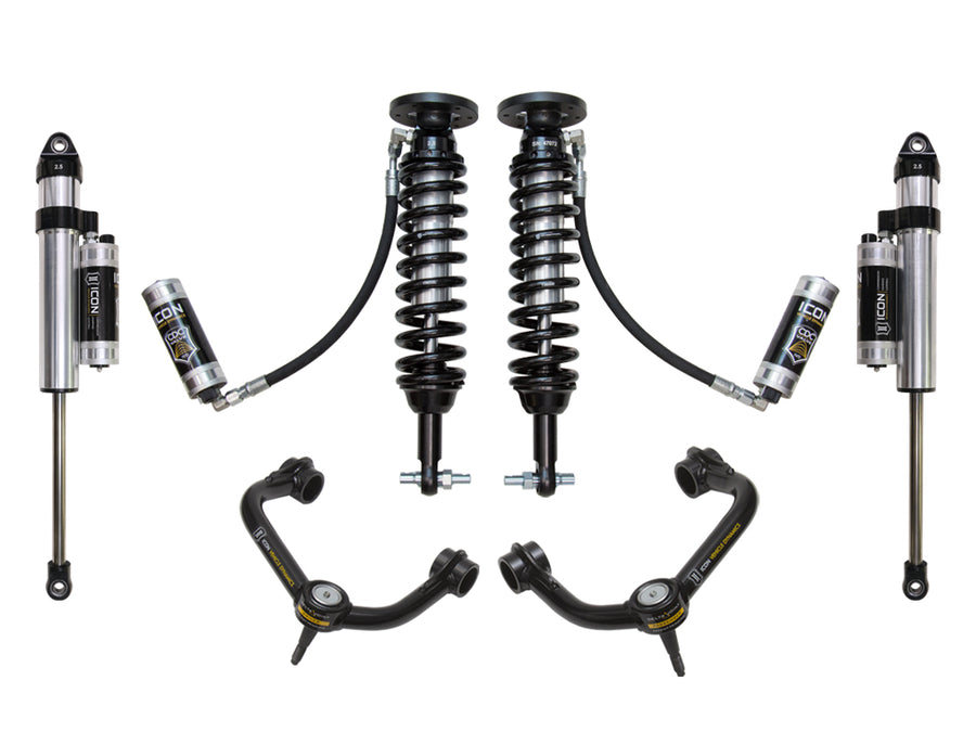 The ICON Vehicle Dynamics 2014 Ford F150 4WD Stage 5 suspension system is the best choice for drivers looking to maximize the on and off-road potential of their trucks and will inspire confidence behind the wheel in nearly any situation. ICON engineers'imary focus is to increase wheel travel and damping ability, which translates into outstanding vehicle control and ride quality both on and off-road. This system includes vehicle-specific tuned 2.5" coilover shocks featuring an external remote reservoir w/ CDCV for exceptional cooling properties and ICON-engineered Eibach coil springs for superior vehicle "feel" through the range of travel. These coilovers are also height adjustable from 1.75-2.63" allowing the use of larger, more aggressive wheel and tire combinations. Tubular upper control arms on the F150 not only add strength and durability, but help retain factory alignment spec range increasing caster over stock. ICON 2.5 Series Piggyback rear shocks w/ CDCV utilize a vehicle-specific valving that balances the performance of the truck from front to rear. 2.5" CDC reservoir front and rear shocks ensure optimum performance by increasing the duration of consistent damping regardless of situation, keeping the shocks at a cooler operating temperature during heavy use. ICON's CDC Valve upgrade is included in this stage front and rear for those desiring an easy way to tune the ride externally with 10 settings from soft to hard.