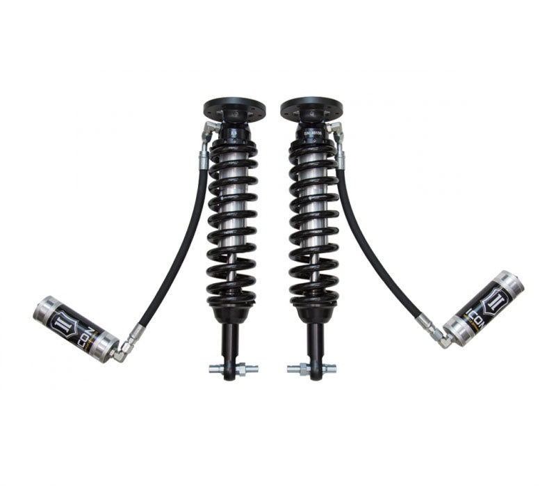 ICON Vehicle Dynamics V.S. Series 2.5" remote reservoir coilover shocks are an incredible upgrade for the front end of the 2015-UP Ford F150 2WD. ICON'ehicle-specific valving provides a sport tuned feel on and off-road while offering 1.75-3" of lift height adjustability for use of larger, more aggressive wheel and tire combinations. The larger 2.5" shock body and increased piston area over stock components provides improved damping ability and outstanding ride characteristics across varying types of terrain. Remote reservoirs ensure optimum performance by increasing the duration of consistent damping regardless of situation, keeping the shocks at a cooler operating temperature during heavy use. When paired with ICON rear 2.0 Aluminum Series or 2.5" Series shocks, vehicle control will be balanced front to rear resulting in the best overall driving experience for your F150.