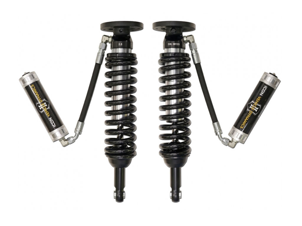 The ICON Vehicle Dynamics V.S. 2.5 Series remote reservoir coilover shocks are an incredible upgrade for the front end of the Toyota FJ Cruiser, 4Runner, and Lexus GX platforms. ICON'ehicle-specific valving provides a sport tuned feel on and off-road while offering 0-3.5" of lift height adjustability for use of larger, more aggressive wheel and tire combinations. ICON'arger 2.5" shock body and increased piston area over stock components provides improved damping ability and outstanding ride characteristics across varying types of terrain. Remote reservoirs ensure optimum performance by increasing the duration of consistent damping regardless of situation, keeping the shocks at a cooler operating temperature during heavy use. These extended length versions offer increased wheel travel but also require the installation of aftermarket upper control arms in conjunction with the coilovers.