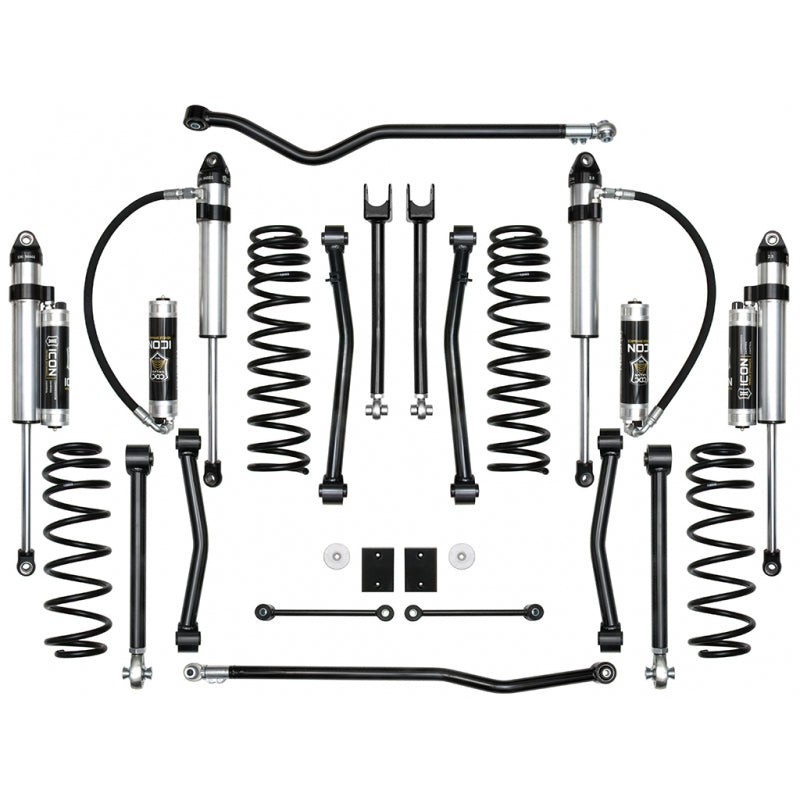 The ICON Vehicle Dynamics Stage 8 2.5" Suspension System for the 2018-UP Jeep Wrangler JL is designed for the driver looking to drastically improve the performance and ride quality of their vehicle. This Stage 8 system includes 2.5" lift dual rate coil springs, upgraded 2.5 Series remote reservoir shocks with vehicle specific valving and ICON's CDC (Compression Damping Control) technology, tubular steel adjustable front upper links, fixed front lower links, fixed rear upper links, adjustable rear lower links, adjustable front and rear track bars, bump stop spacers, sway bar links, and all necessary hardware to complete the installation. With this combination of components, ICON was able to increase wheel travel numbers by over 30% (3" front, 2" rear), redefining the potential of the 2018-UP JL. The front lower links included with this system are constructed from thick wall steel tubing, provide increased castor numbers, and feature dual durometer bushings for noise free operation, maximum articulation, and minimal bind. The Stage 8 system allows for fitment of 35" tires when used with ICON'ecommended wheel specifications. For users looking to install 37" tires, an optional bump stop spacer kit (PN: 22029) is available.