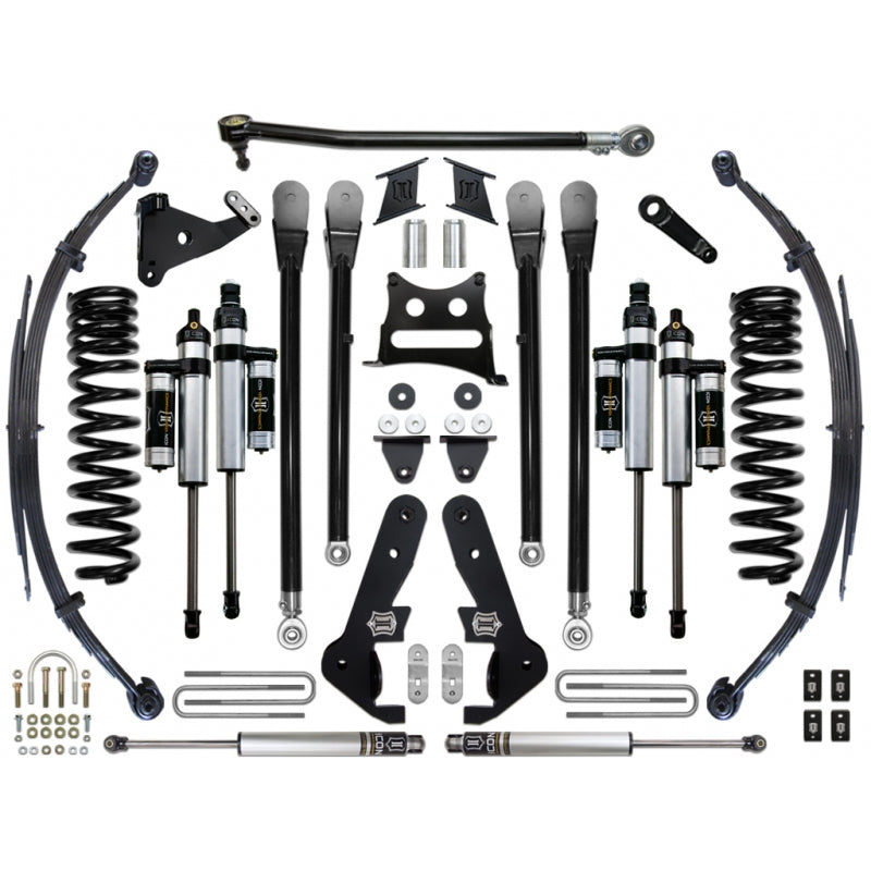 This ICON Vehicle Dynamics 7" suspension system is a great way to lift your 4WD 2017-UP Ford F250/350 Super Duty while drastically improving ride quality and performance. This suspension system is perfect for on-road and off-road use including towing, job site duty, and hardcore off-road adventure. ICON's 7" Stage 4 System is comprised of dual rate coil springs, progressive leaf springs, 4-Link kit, adjustable track bar, dual opposing steering stabilizer kit, ICON 2.5 Series piggyback reservoir front and rear shocks, plus all of the necessary hardware for installation.